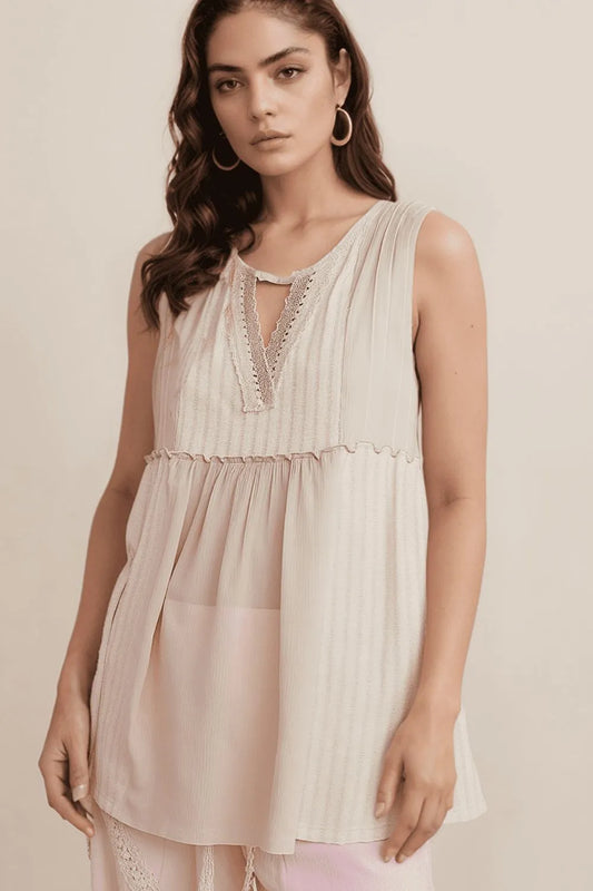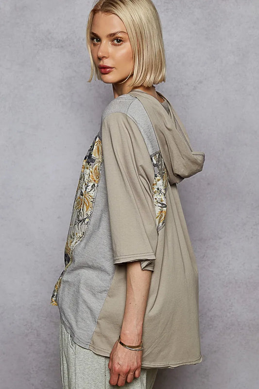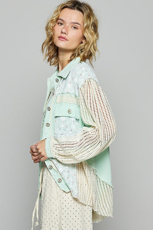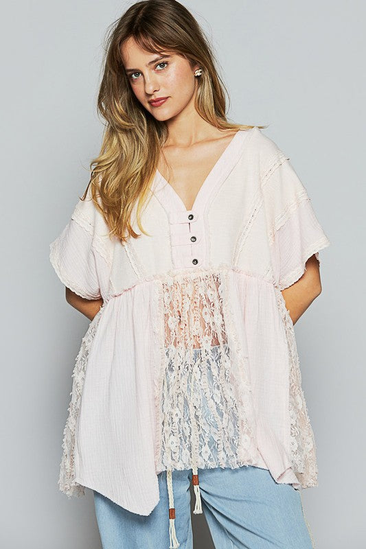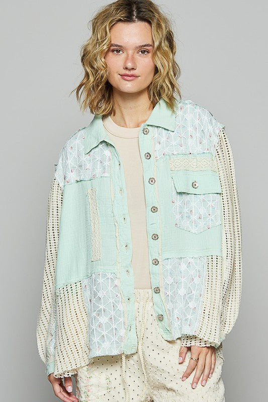 POL Vintage Washed Lace Patchwork Printed Half Button Top