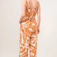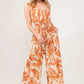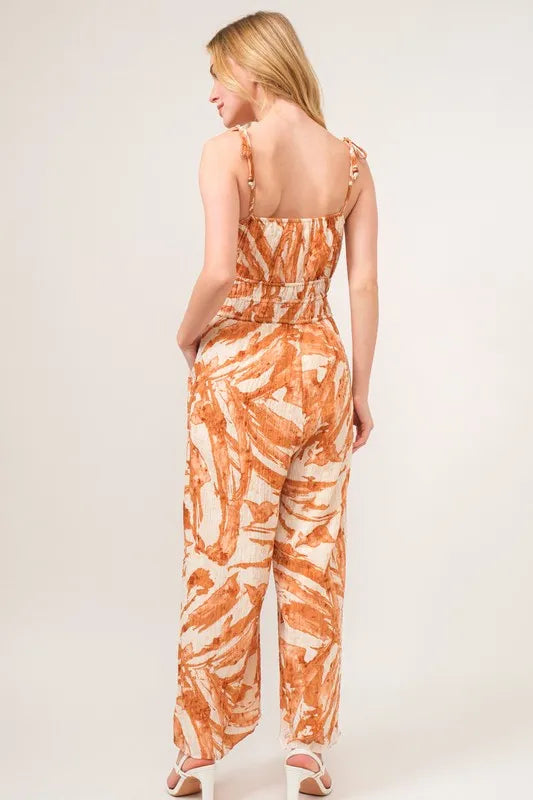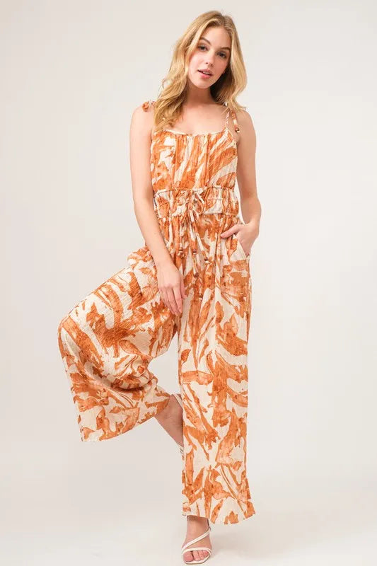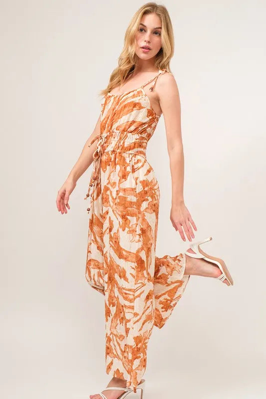 The Waist Strings Abstract Print Wide Leg Jumpsuit features a stylish abstract print and waist strings detailing for a trendy look. Perfect for making a fashion statement and ideal for various occasions.