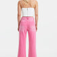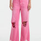 Introducing our High-Waisted Non-Stretch Flare Pants, a perfect addition to your casual wardrobe. These pants feature a stylish pink base color that adds a pop of femininity to your outfit. The non-stretch fabric offers a comfortable and relaxed fit, ideal for everyday wear. The natural distressed effects add an effortless and worn-in look, giving these pants a touch of vintage charm. Complete with frayed edges at the hem, these pants exude an edgy and trendy vibe. Pair these versatile pants with a basic tee and sneakers for a laid-back and chic outfit, or dress them up with a blouse and heels for a more elevated look. Whether you're running errands or going out for brunch with friends, these high-waisted flare pants will ensure you look stylish and fashion-forward. Embrace the casual yet fashionable style with these eye-catching pants.