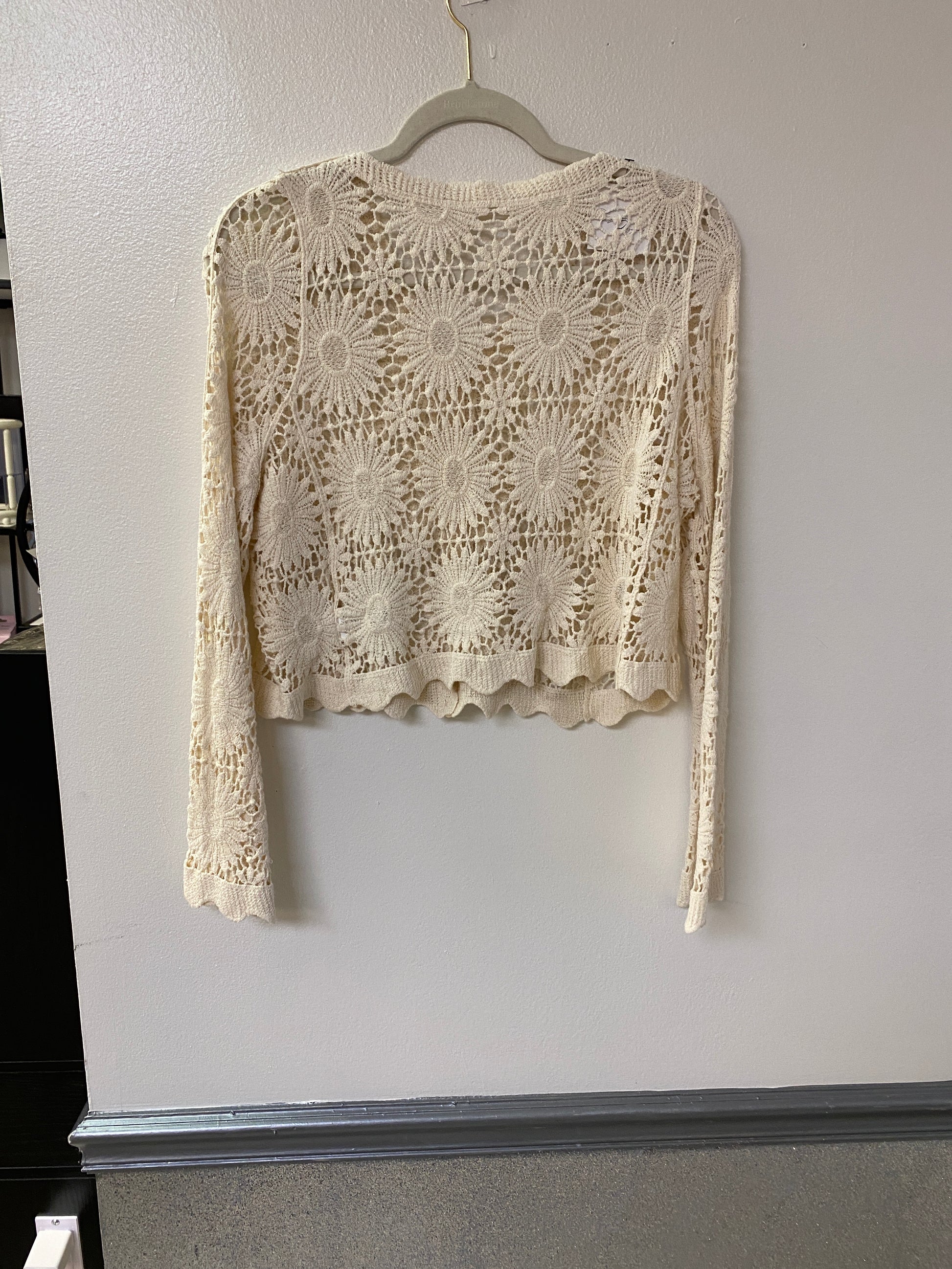 Elegant cream crochet cardigan with button-up front. Perfect for layering and adding a touch of sophistication to any outfit.