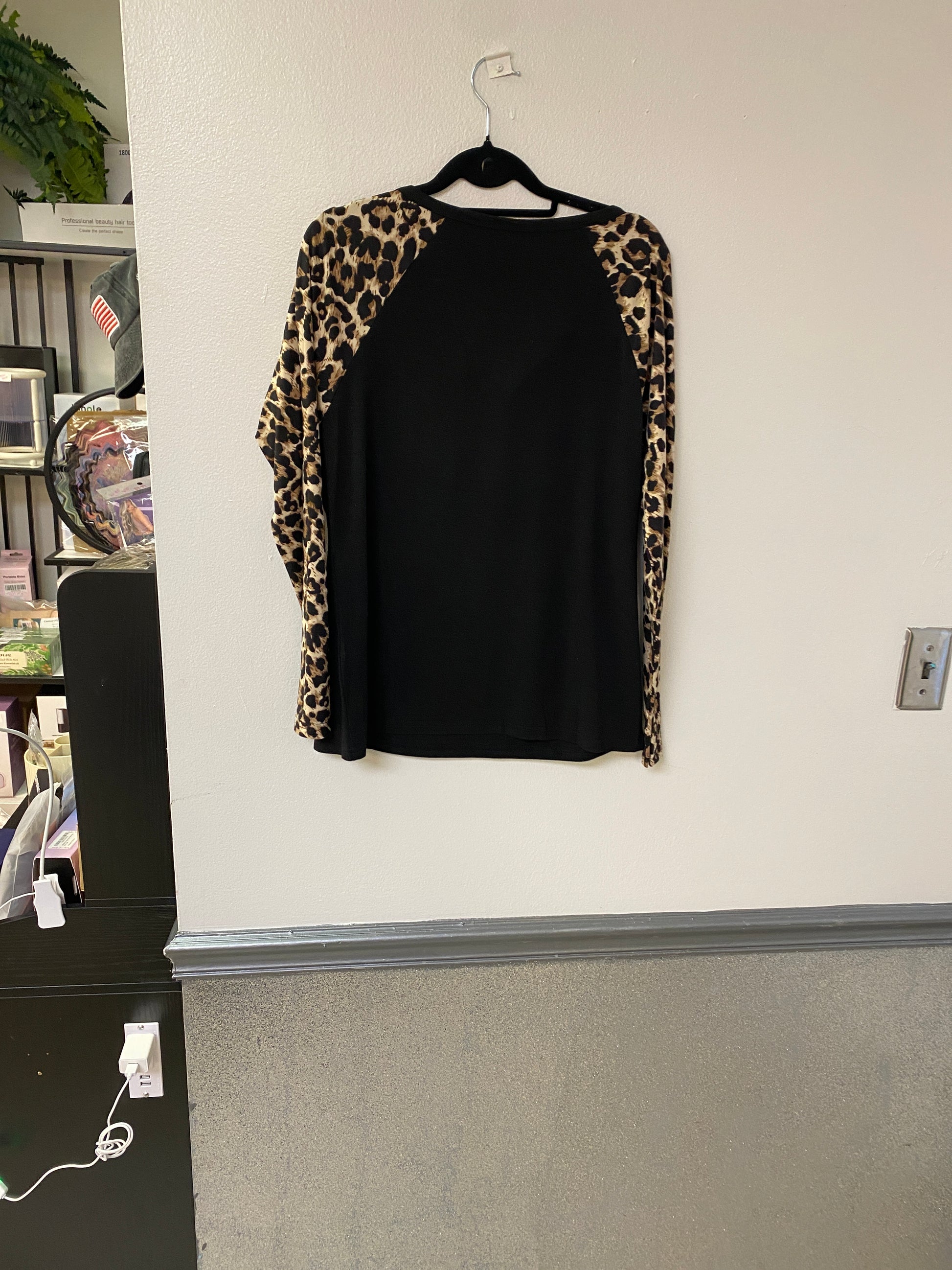 Stylish black top with eye-catching leopard print sleeves and pocket. Perfect for a chic, casual look.