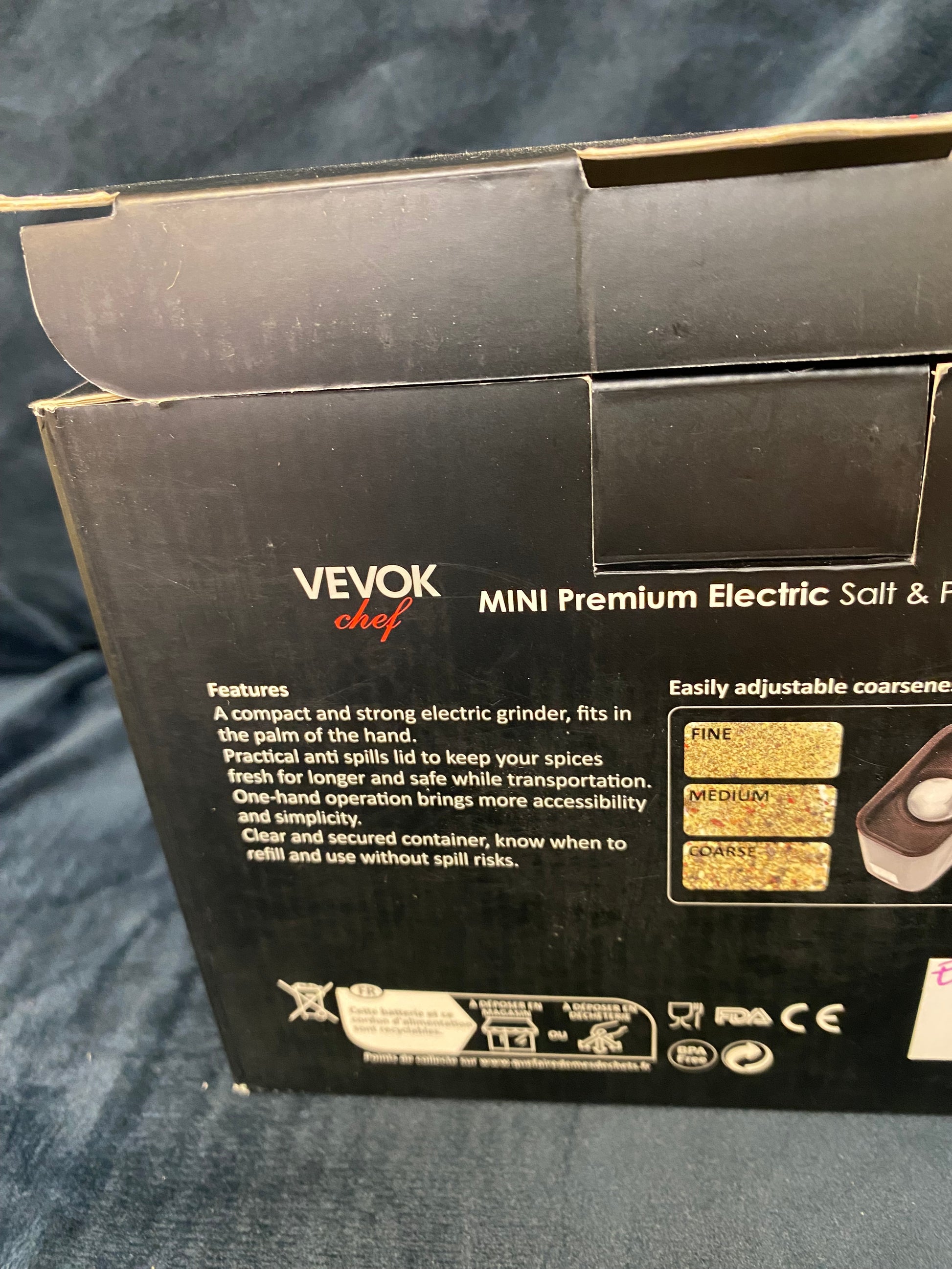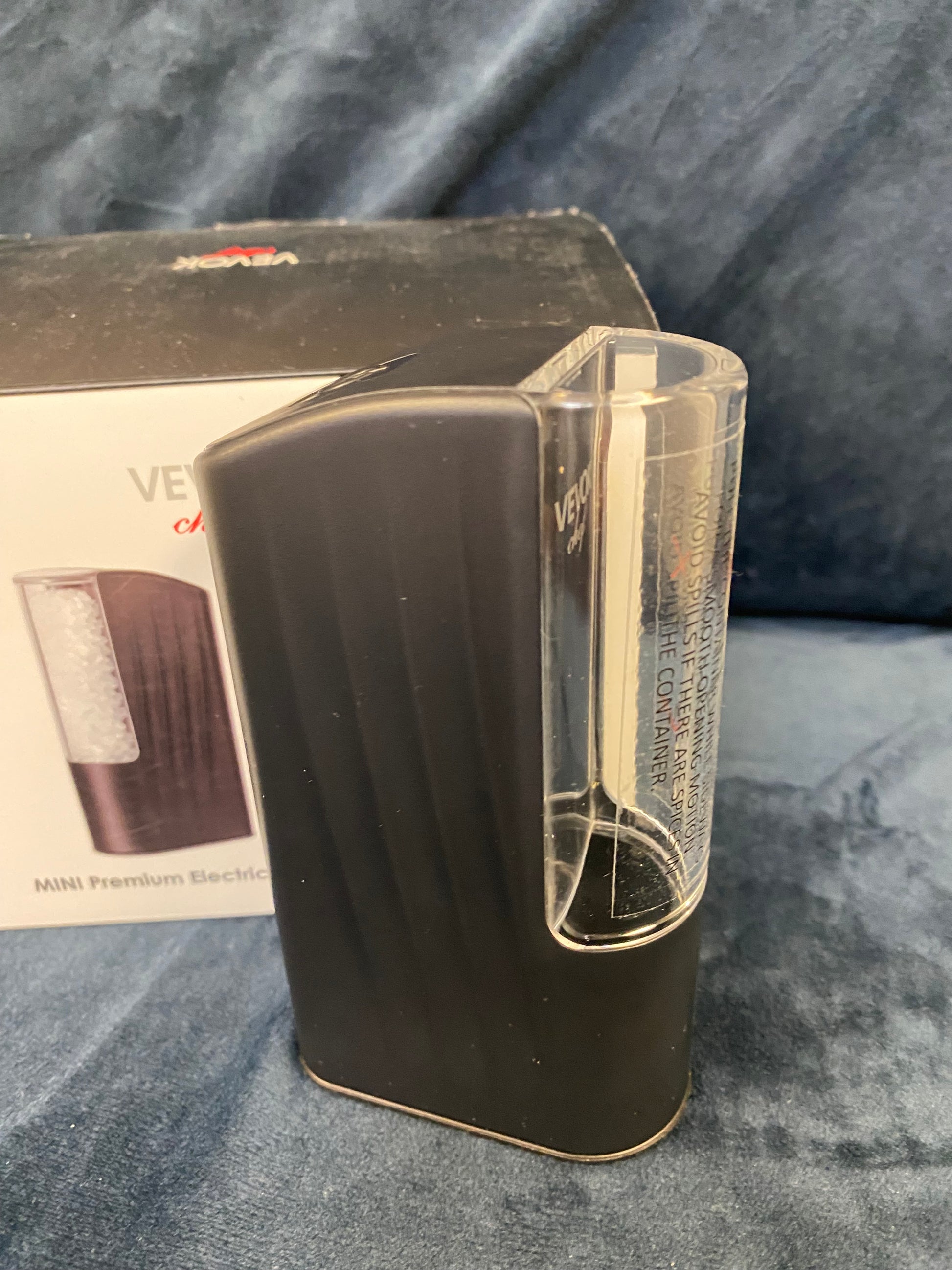 VEVOK Chef electric salt and pepper grinder set. Sleek black design with clear compartments.