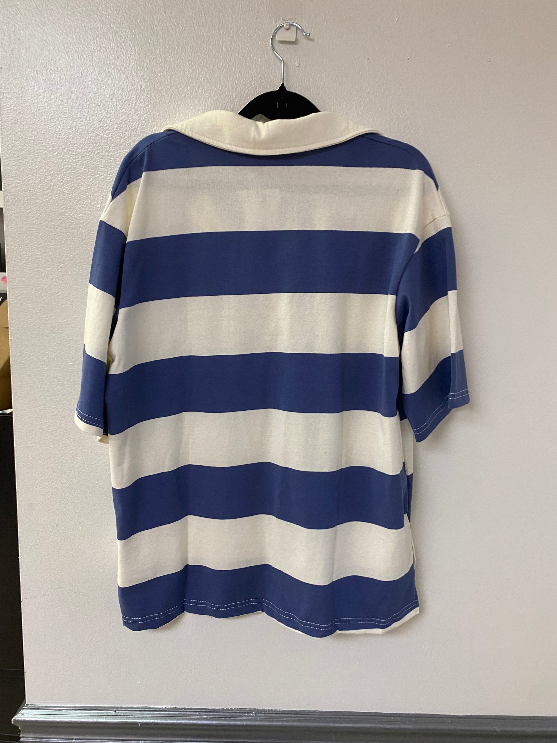 Chic top with bold navy and white stripes. Perfect for casual outings. Comfortable and stylish.