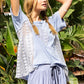 The Short Sleeve Lace Crochet Panel Top is a delicate and elegant piece that exudes femininity. The intricate lace crochet panels add a touch of charm and sophistication to this classic short sleeve top. With a flattering silhouette and versatile design, this top can be dressed up or down for various occasions. The soft and breathable fabric ensures comfort and style throughout the day. Pair it with jeans or a skirt for a chic and romantic look that will turn heads. Elevate your wardrobe with this lovely lace crochet panel top that is perfect for adding a touch of refinement to your outfit.