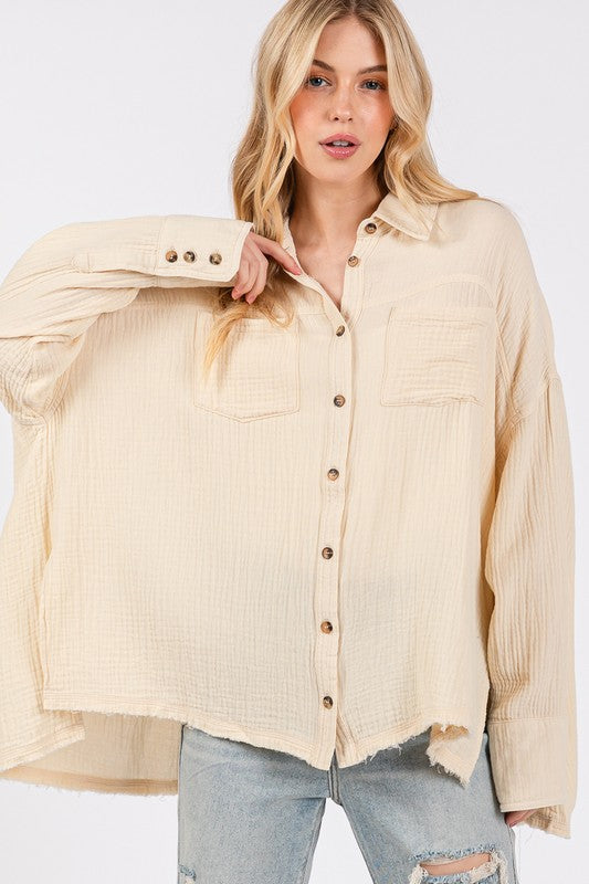 A frayed hem side slit button-down shirt is a chic and contemporary take on a classic wardrobe staple. The frayed hem adds a trendy and edgy element to the traditional button-down shirt design. Side slits offer a modern twist and allow for ease of movement and added visual interest. This versatile shirt can be dressed up with tailored pants or down with jeans for a stylish and effortless look.