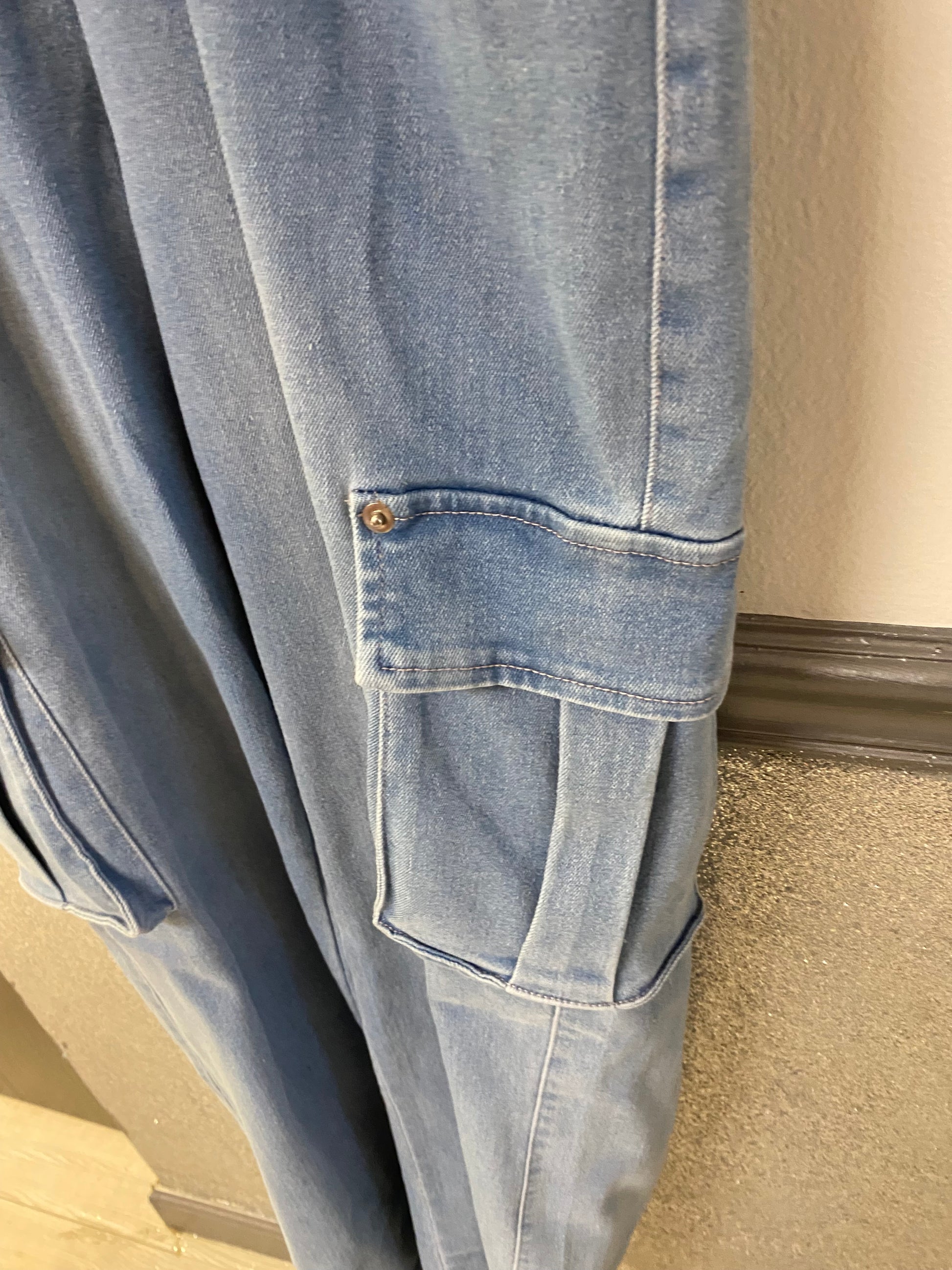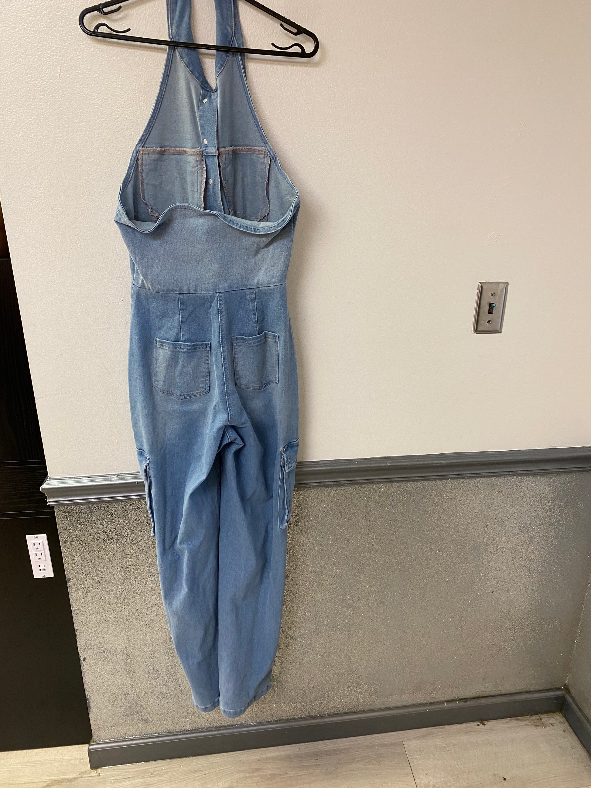 Chic denim halter jumpsuit. Ideal for casual or evening wear. Features button-up front and cargo pockets.